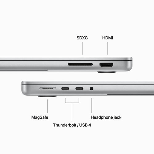 CONNECT IT ALL — This MacBook Pro features a MagSafe charging port, two Thunderbolt / USB 4 ports, an SDXC card slot, an HDMI port and a headphone jack. Enjoy fast wireless connectivity with Wi-Fi 6E and Bluetooth 5.3. Supports one external display.