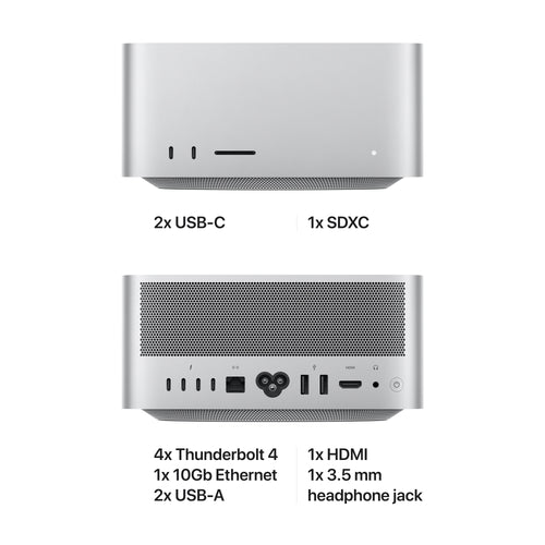 Up to six Thunderbolt 4 ports, two USB-A ports, HDMI port, 10Gb Ethernet port, SDXC card slot, 3.5 mm audio jack