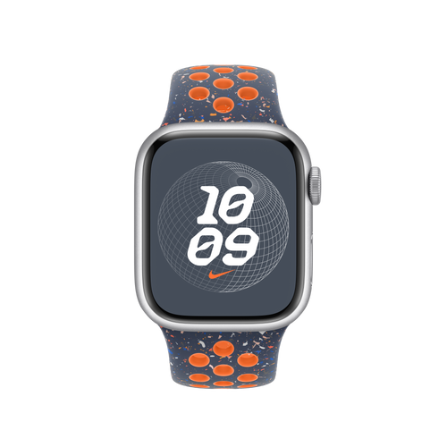Made with compression-moulded perforations for breathability, the Nike Sport Band is durable and strong, yet surprisingly soft. It features colourful flakes that create a randomised pattern, making each strap completely unique. The smooth, dense material drapes elegantly across your wrist and feels comfortable next to your skin. A new aluminium pin-and-tuck closure gives the pin a fresh matt finish. This strap contains at least 32% recycled fluoroelastomer, with each flake containing at least 66% recycled fluoroelastomer.