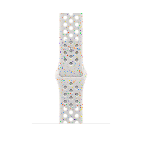 Made with compression-moulded perforations for breathability, the Nike Sport Band is durable and strong, yet surprisingly soft. It features colourful flakes that create a randomised pattern, making each strap completely unique. The smooth, dense material drapes elegantly across your wrist and feels comfortable next to your skin. A new aluminium pin-and-tuck closure gives the pin a fresh matt finish. This strap contains at least 32% recycled fluoroelastomer, with each flake containing at least 66% recycled fluoroelastomer.