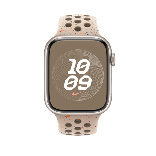 Made with compression-moulded perforations for breathability, the Nike Sport Band is durable and strong, yet surprisingly soft. It features colourful flakes that create a randomised pattern, making each strap completely unique. The smooth, dense material drapes elegantly across your wrist and feels comfortable next to your skin. A new aluminium pin-and-tuck closure gives the pin a fresh matt finish. This strap contains at least 32% recycled fluoroelastomer, with each flake containing at least 66% recycled fluoroelastomer.