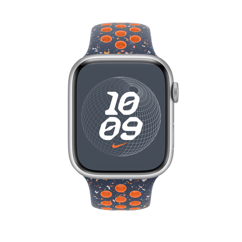 Made with compression-moulded perforations for breathability, the Nike Sport Band is durable and strong, yet surprisingly soft. It features colourful flakes that create a randomised pattern, making each strap completely unique. The smooth, dense material drapes elegantly across your wrist and feels comfortable next to your skin. A new aluminium pin-and-tuck closure gives the pin a fresh matt finish. This strap contains at least 32% recycled fluoroelastomer, with each flake containing at least 66% recycled fluoroelastomer.