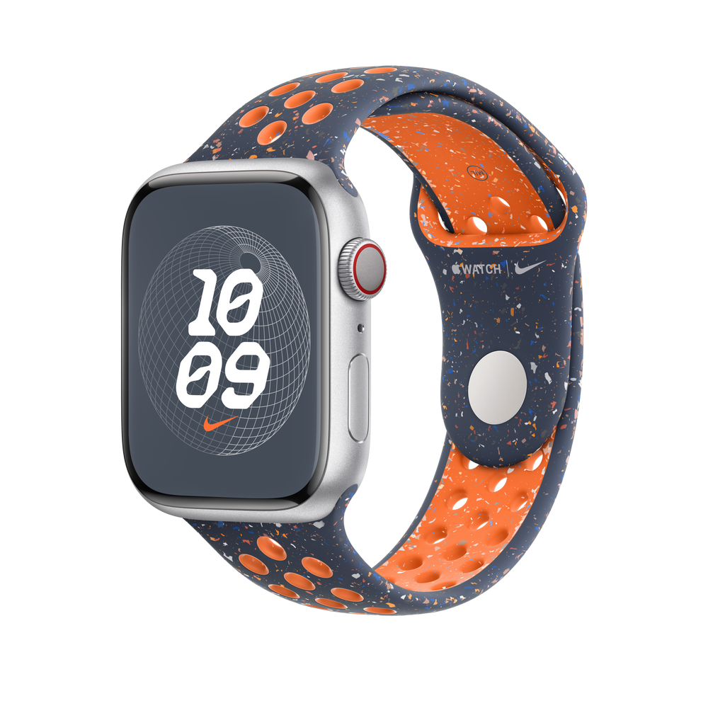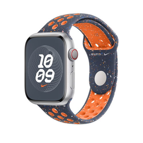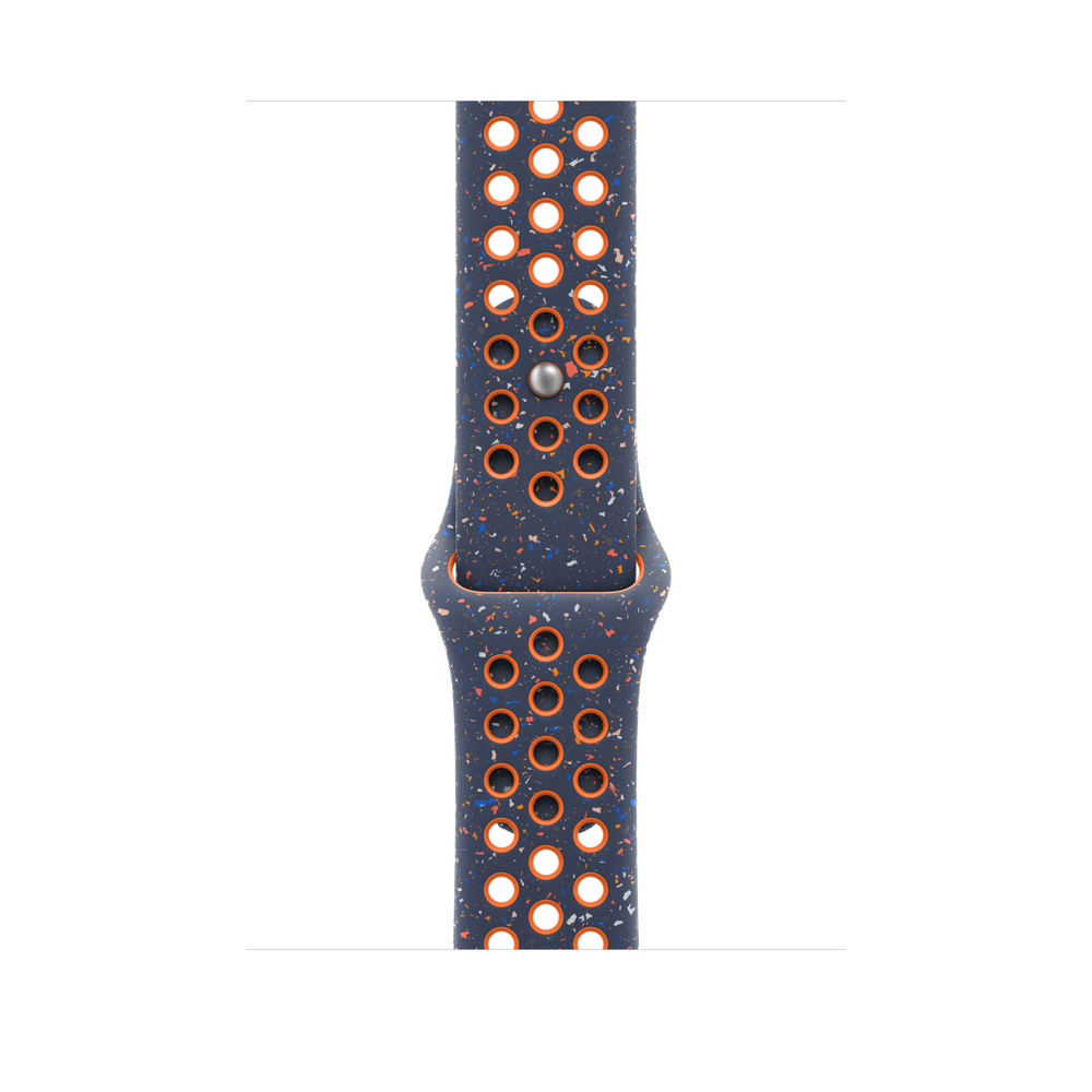 Made with compression-moulded perforations for breathability, the Nike Sport Band is durable and strong, yet surprisingly soft. It features colourful flakes that create a randomised pattern, making each strap completely unique. The smooth, dense material drapes elegantly across your wrist and feels comfortable next to your skin. A new aluminium pin-and-tuck closure gives the pin a fresh matt finish. This strap contains at least 32% recycled fluoroelastomer, with each flake containing at least 66% recycled fluoroelastomer.